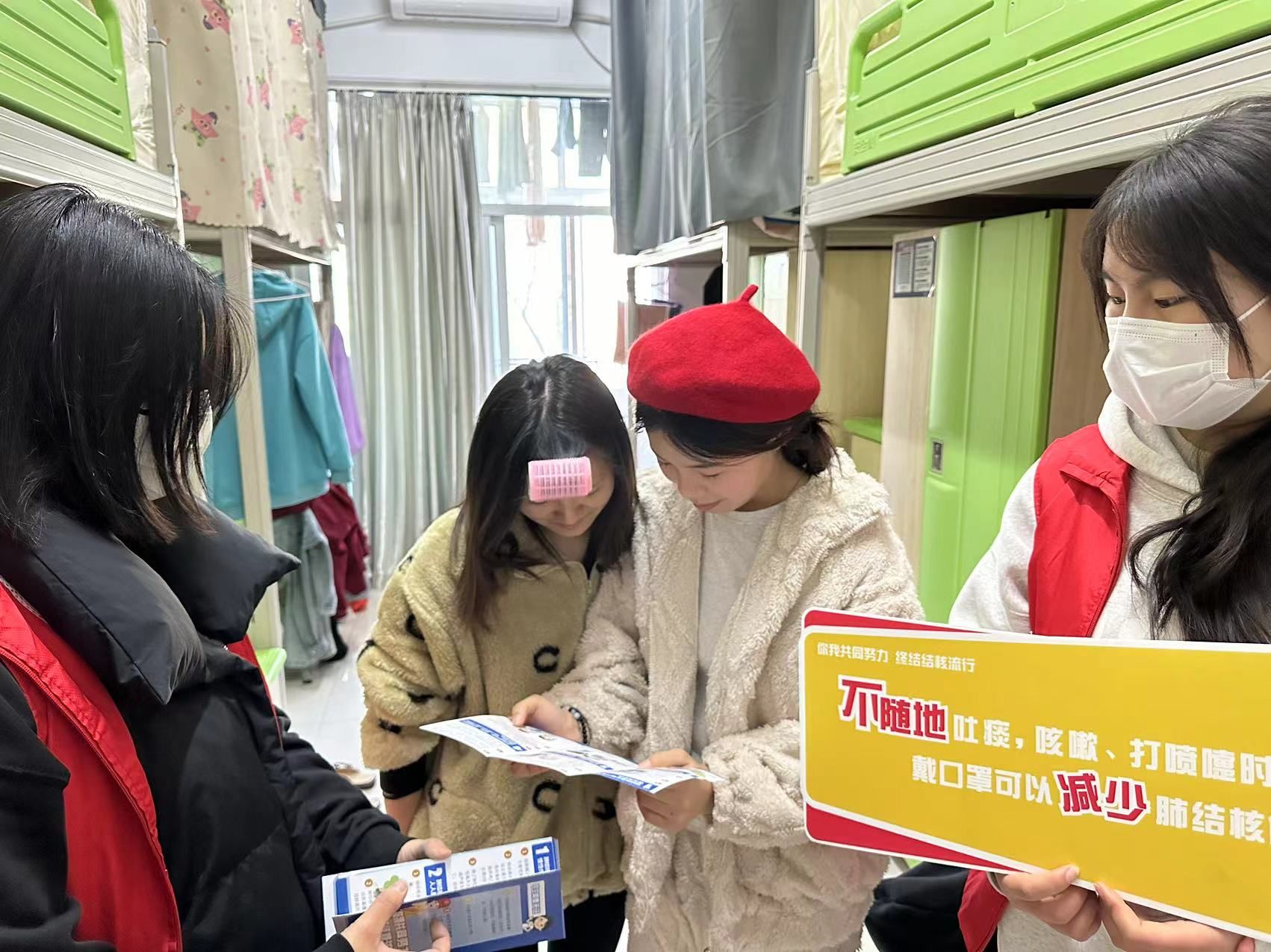 结核病是仅次于新型冠状病毒感染的世界第二大单一传染源死因,是全球关注的重大公共卫生问题之一。春期各种疾病多发,学校人员密集,商学院学生会积极配合学院工作,通过发放宣传手册,面对面的结核病防治知识宣讲,邀请寝室中的同学和宣传展板来一次亲密的合影,让同学们进一步的交了解到了结核病的知识,真正落实“防控结核,人人有责”。