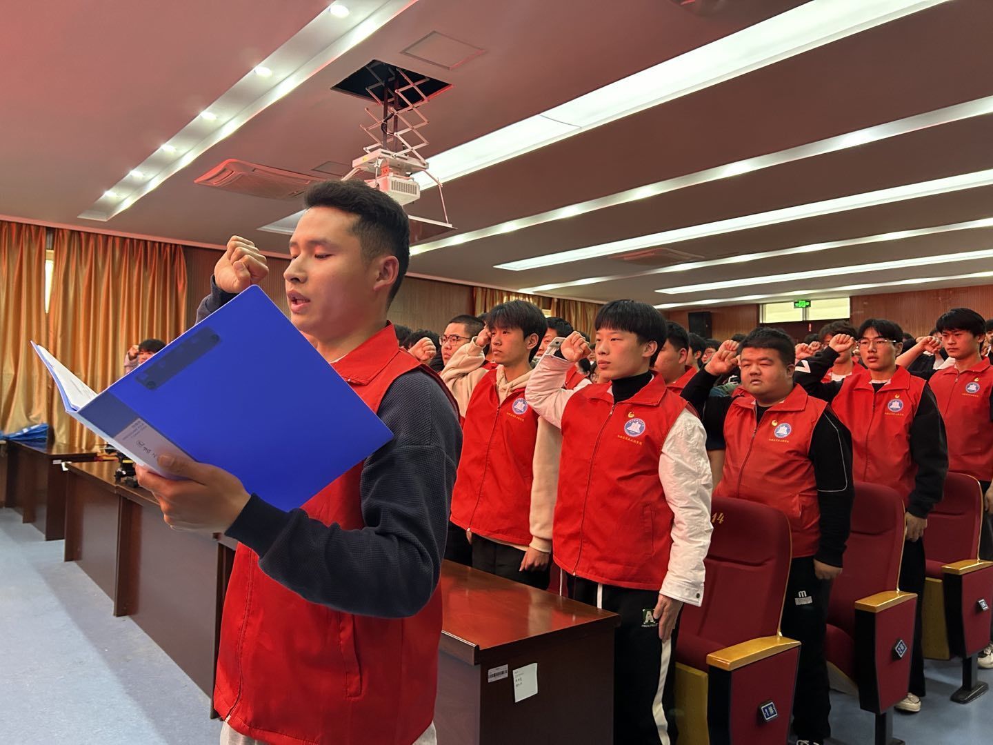 会议第三项,学生代表支道辉带领全体志愿者起立宣誓。仪式上,青年志愿者们佩戴团徽,面对志愿队旗做出庄重承诺。铮铮誓言,展现了新葡的京官网青年志愿者们积极投入于志愿服务的热忱之心。
