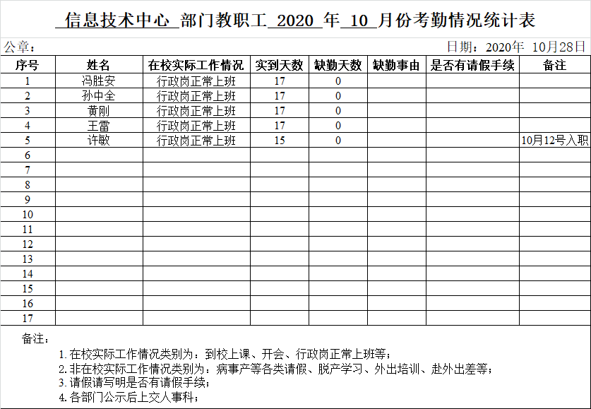 现将信息技术中心2020年10月份考勤情况公示三天。有异议者请与3854569联系。