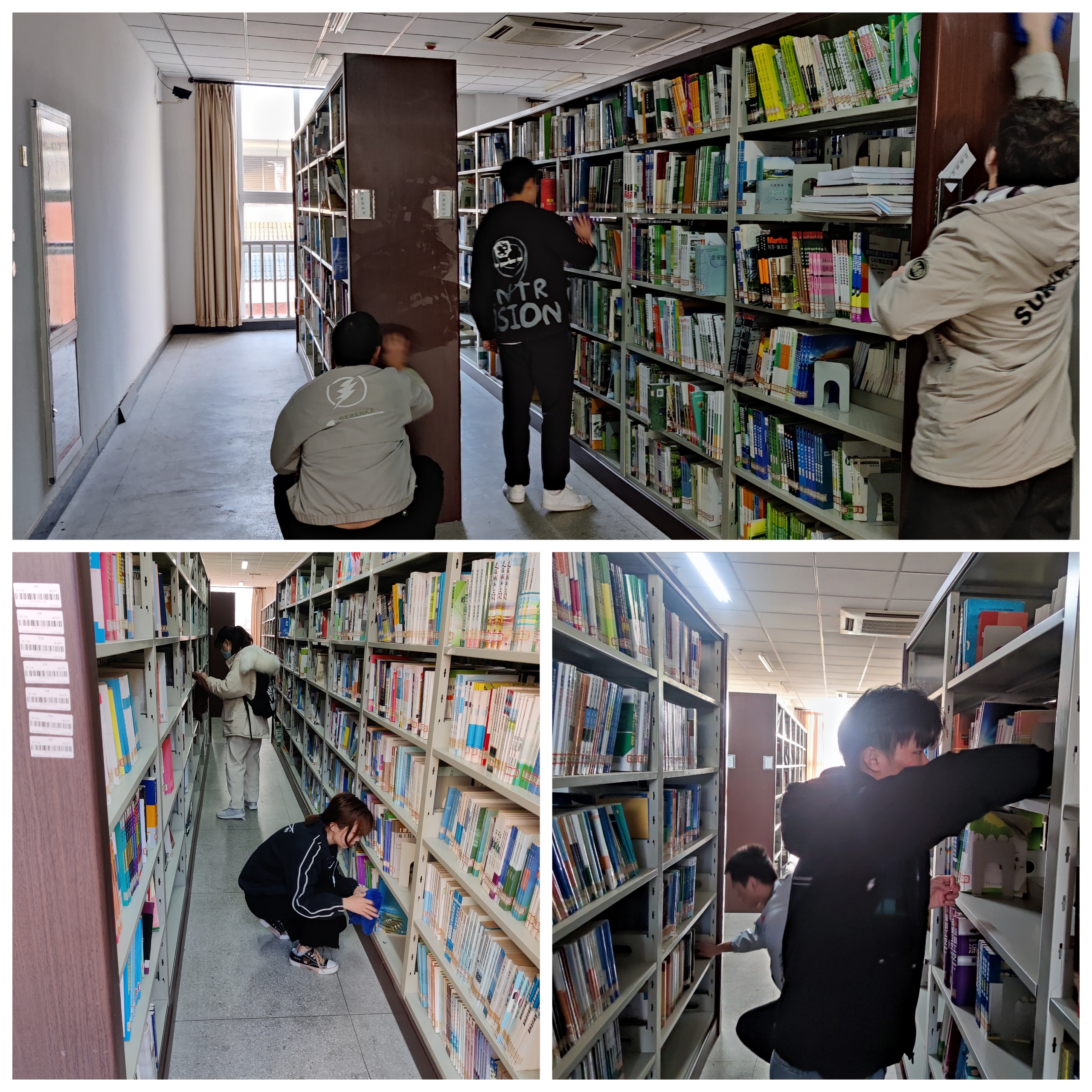 为了保证活动能够高效、有序、安静的进行,各班班长首先将班级同学分成小组开展工作,有擦拭书架的,有整理搬运书籍的,有打扫卫生的。同学们在各队组长的带领下有条不紊的忙碌了起来,充分发挥了不怕脏、不怕累的精神。经过同学们的努力,图书馆整体环境焕然一新。