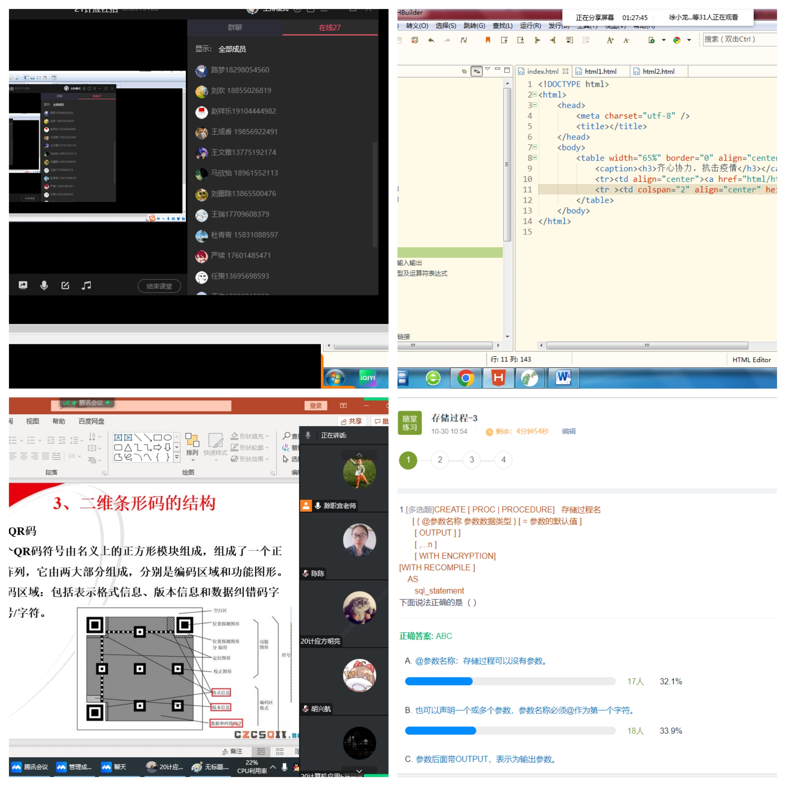 10月29日、30日新葡的京官网积极开展了20级、21级社招班的第二次线上直播授课,各授课老师精心谋划,借助学习通、钉钉等平台或软件,采用了腾讯会议、班级群QQ屏幕共享等直播形式,给学生们送上了一堂堂精彩纷呈、有趣高效的直播课。学生自律配合,自觉遵守课堂纪律,按时到课听讲,认真完成作业,共同守护“云课堂”。