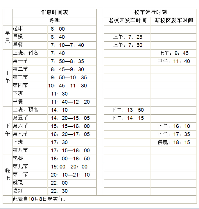 学院经研究决定,国庆节后学院执行冬季作息时间,并对校车时刻表进行相应调整,具体如下表: