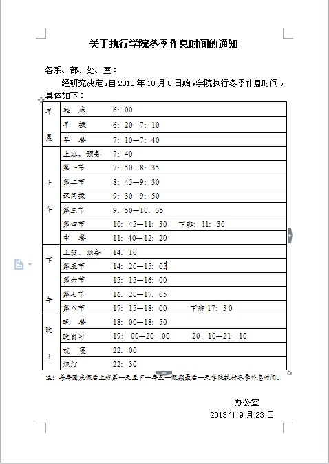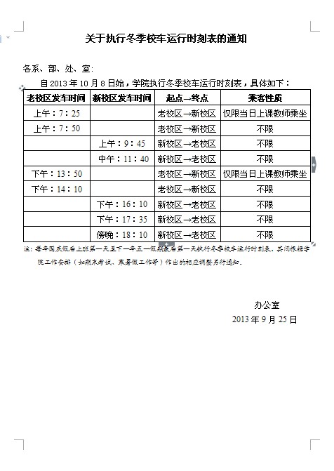 关于学院冬季作息时间表、校车运行时刻表的通知