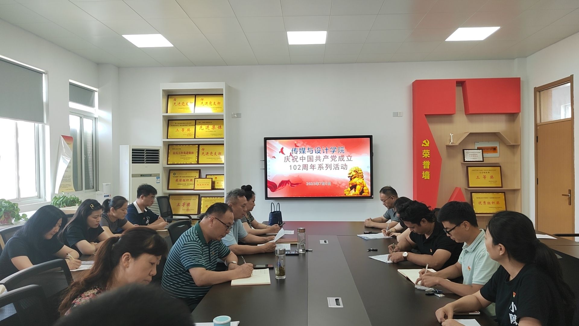 7月5日,传媒与设计学院党总支组织全体党员教师在德馨楼会议室召开庆祝中国共产党成立102周年全体党员大会。会议由学院党总支书记王广保主持,全体党员教师参会。