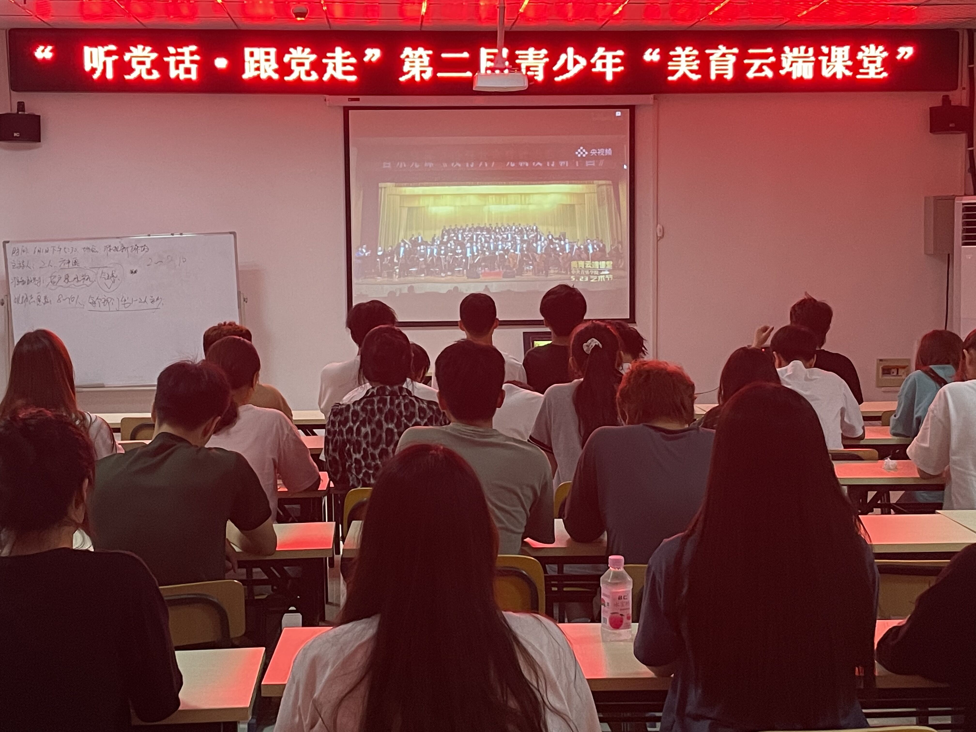 为提高青年学生审美素养,以美育人、以美化人、以美培元,贯彻落实习近平总书记关于抓好青少年党史学习教育、注重方式方法创新的重要指示精神,6月17日晚上,传媒与设计学院组织20级班级骨干近30人来到大学生活动中心328培训室,集中观看“听党话·跟党走”第二届青少年“美育云端课堂”。