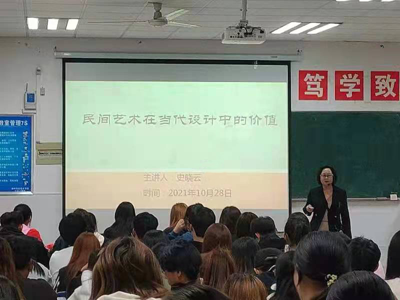 为了使学生在设计中能够很好地融入中国传统元素,一场题为“民间艺术在当代设计中的价值”的讲座于2021年10月28日在传媒与设计学院4110教室举办,本次讲座由史晓云副教授主讲,室内设计、传播与策划、广告设计班100多位同学聆听了讲座。