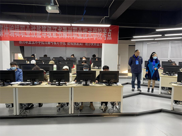 本次考证考点布置规范,严格注意疫情防范工作,每位学生佩戴口罩扫码进考场,现场秩序井然,党总支副书记王琴、传媒与设计学院院长闻建强、副院长杨之武亲临现场指导考试工作,考务工作人员严格遵守工作流程,宣读考场纪律。整场考试技术保障有力,考试工作顺利完成。