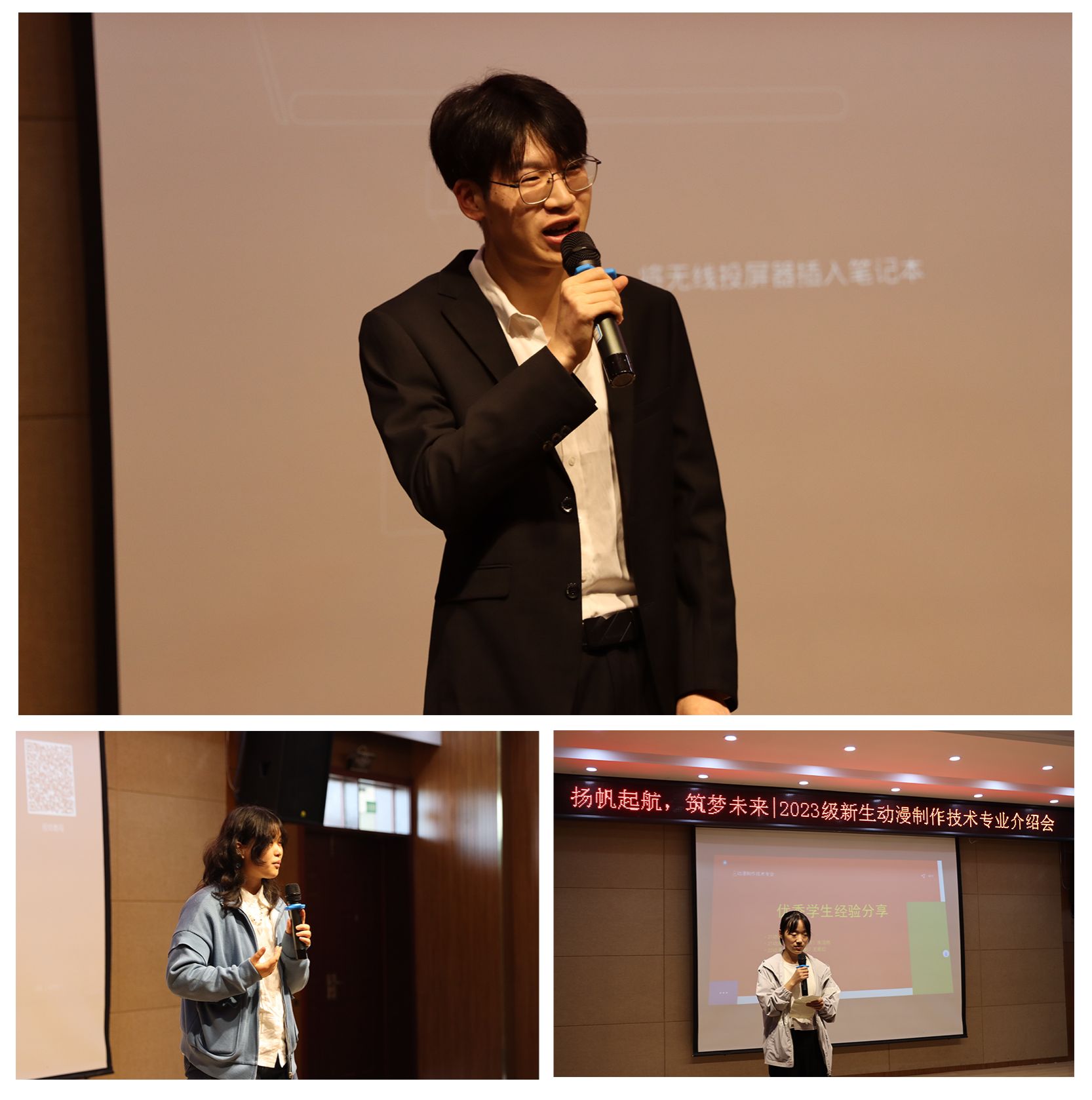 随后,范文娟老师从大一、大二、大三的任务分解角度出发,鼓励新生们要努力学习、不断进取。她指出,动漫制作技术专业是一个需要不断实践和创新的学科,希望新生们能够尽快适应专业学习,积极参与到各种实践活动中来。周苏亭老师则详细介绍了动漫制作技术专业的实训室、产教融合、毕业就业相关事宜,他表示将全力为新生们的成长和发展提供支持和帮助。王一超老师则鼓励大家不管是二维动画还是三维动画,都要找准自己喜欢的方向,积极努力投身到自己热爱的事业中去,并为之不懈努力。