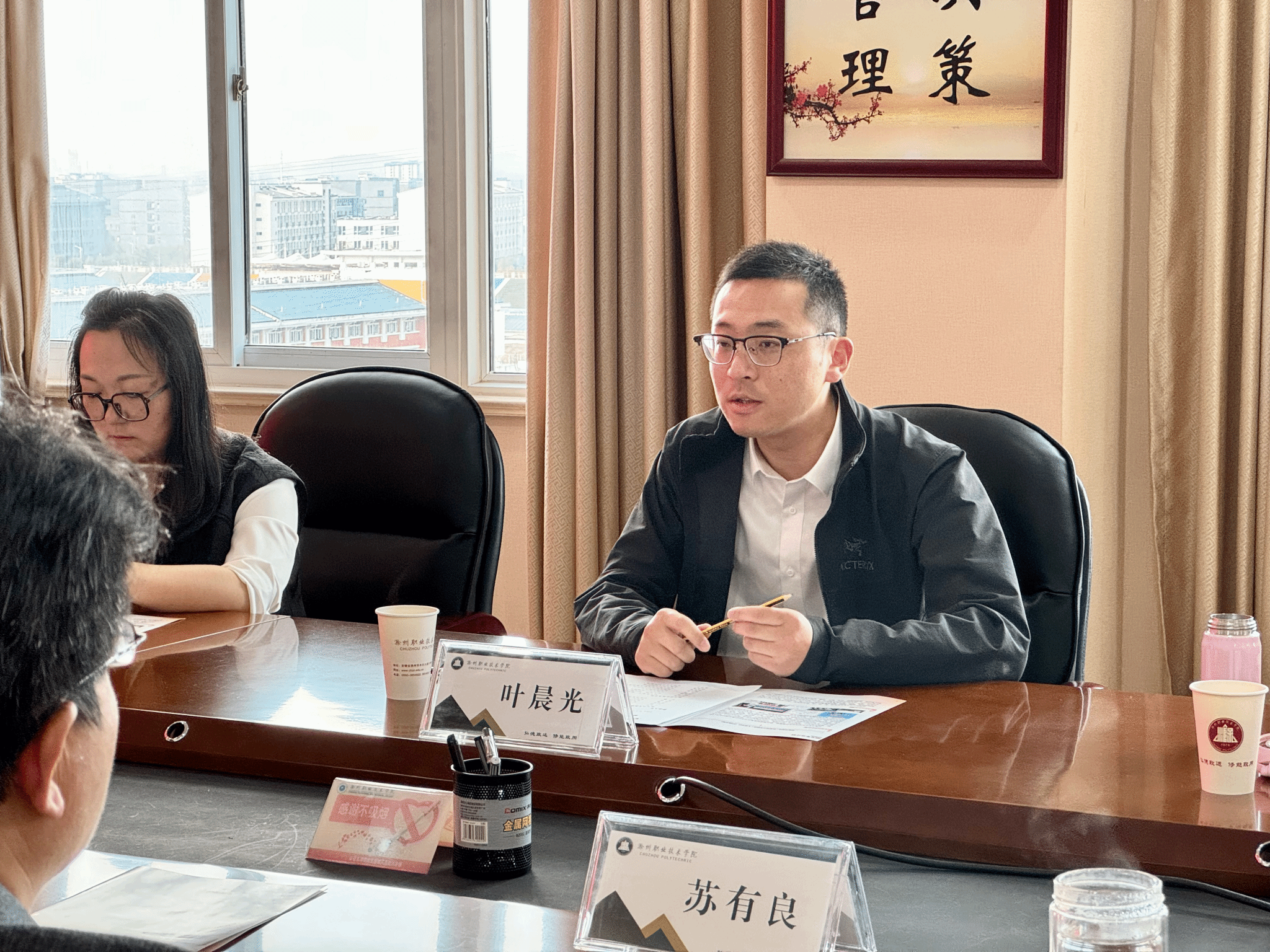 叶晨光对学校的热情接待表示感谢,并介绍了滁州市文旅集团的发展状况和未来发展规划,针对助力乡村振兴和地域文化推广两大板块,希望和学校开展更加广泛的交流合作,协同培养文化创意高层次人才,联合开发文化产业项目。