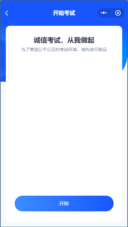 考试登录后,进入考试列表,点击“开始”进入考试页面。系统将调用前置摄像头,对考生进行拍照,人脸识别,成功后,方可进入考试;