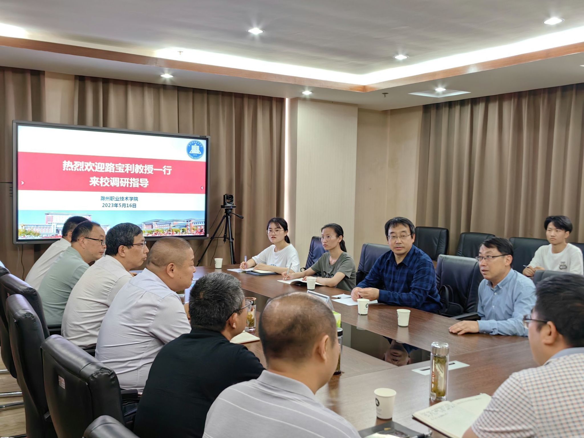 5月16日下午,安徽师范大学教育科学学院博士生导师路宝利教授率课题组成员来新葡的京官网调研职业教育工作。滁州市教体局职业与成人教育科蒋新华科长陪同调研,安徽滁州职教集团秘书处、科技处(职教研究所)相关工作人员、部分教学院部负责人和教师代表参加调研座谈会。科技处处长(所长)肖陆飞主持座谈。