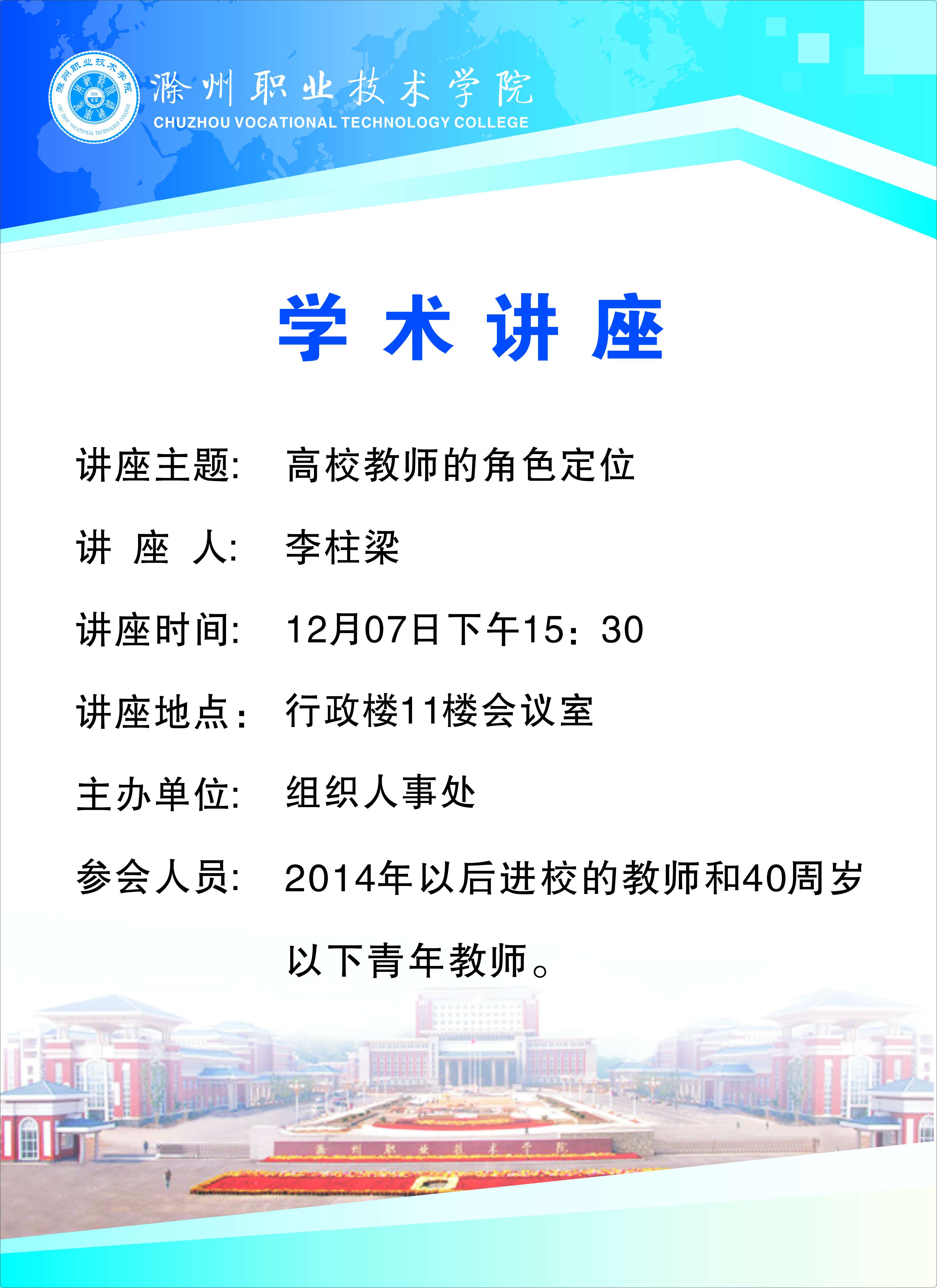 本周三(127日)下午3:30,组织人事处邀请李柱梁院长于行政楼11楼报告厅举办《高校教师的角色定位》的讲座,请各系部处室组织近3年入职的新进教师和系部40岁以下青年教师代表参会。
